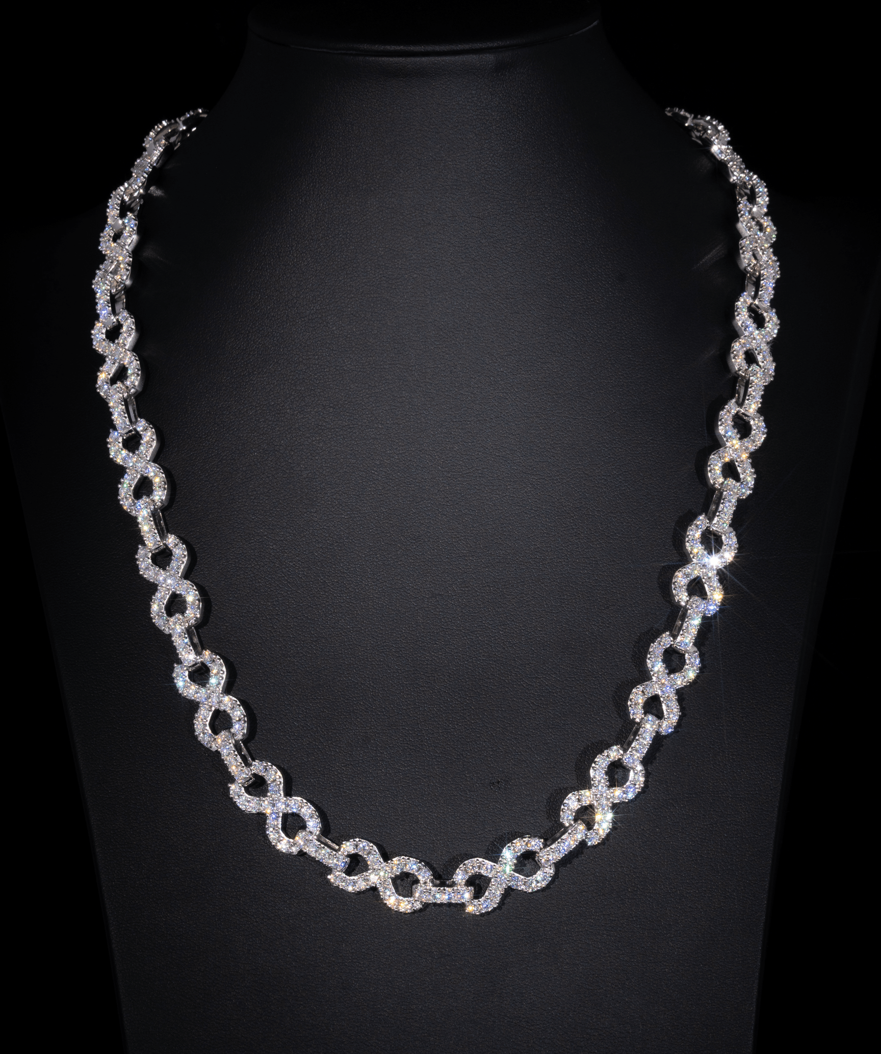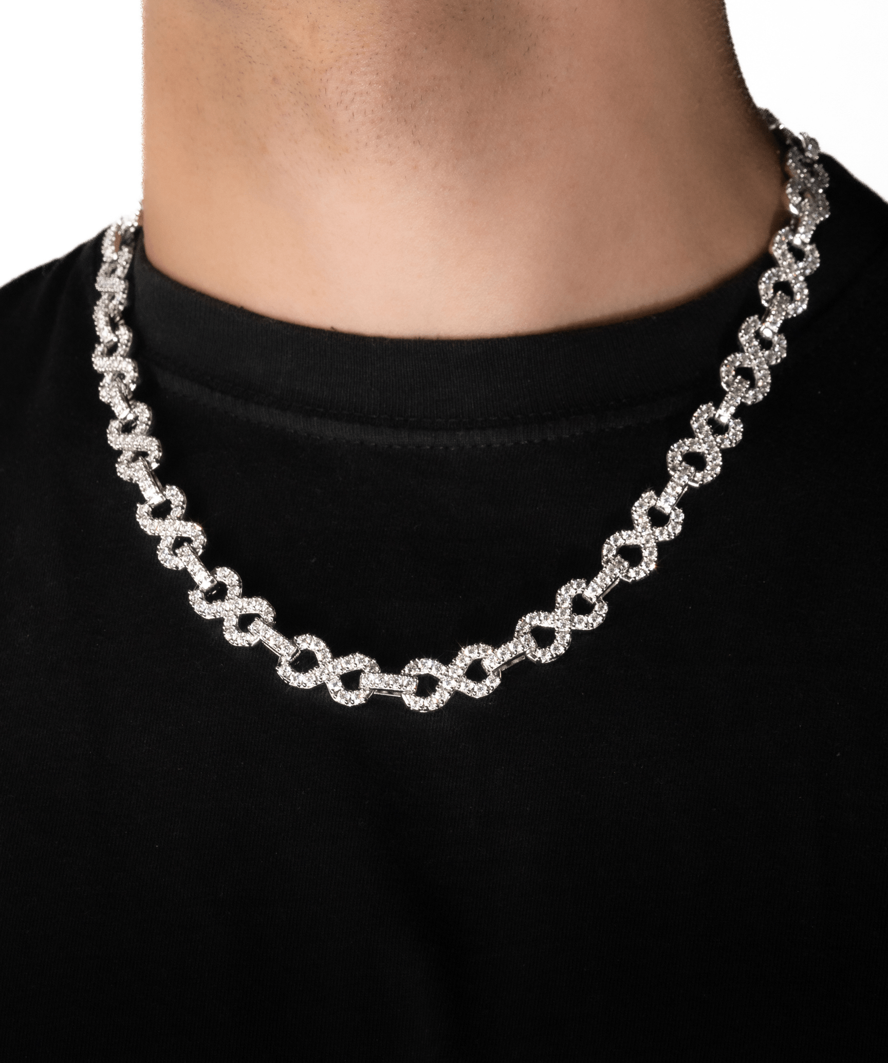 ICED LONDON Infinity Link Chain er et kontinuerligt udtryk for forbindelse og præcision og skiller sig ud med sin sammenflettede silhuet og dristige flydende udstråling. Hver sten er omhyggeligt formet for at fremhæve det flydende mønster og levere en slående glans fra alle vinkler.
