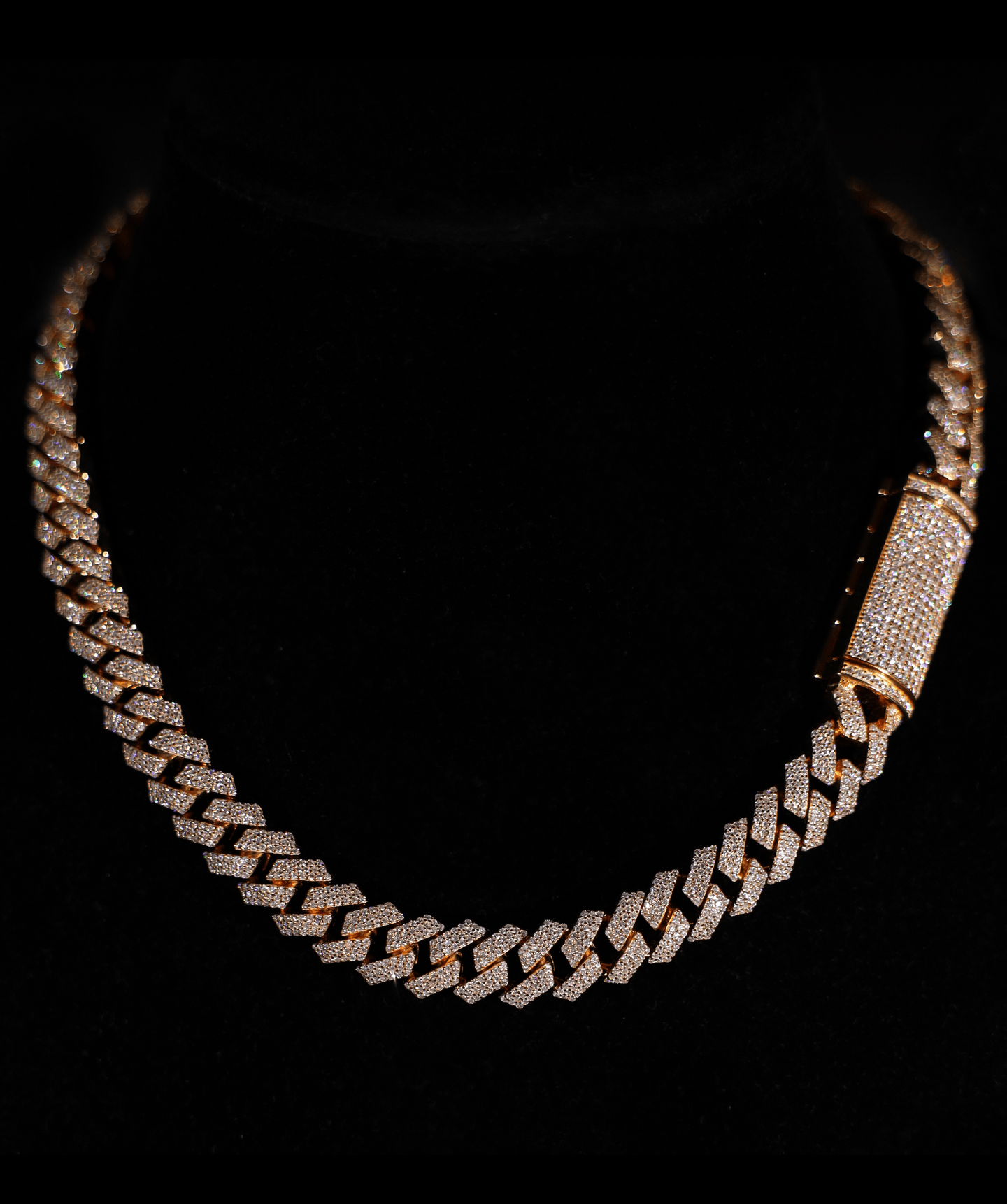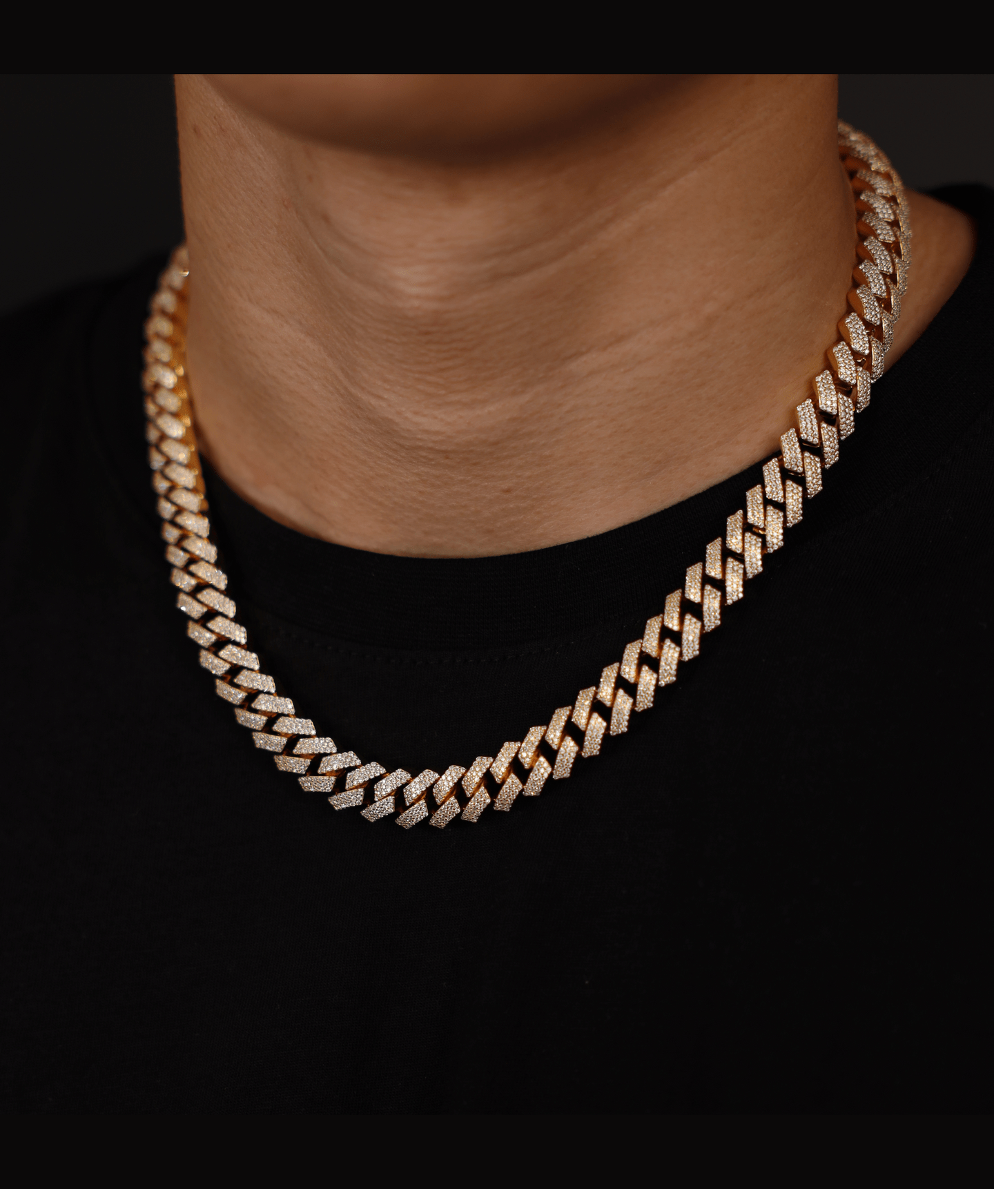De 12 mm brede Cubaanse schakelketting met pinnen is een toonbeeld van precisie en vakmanschap. Elke steen is gezet met pinnen, wat zorgt voor maximale lichtreflectie en diepte. De basis van 925 zilver, afgewerkt in geelgoud, verhoogt de duurzaamheid en glans, wat zorgt voor een blijvende uitstraling. De schakels zijn gestructureerd voor een solide, verzwaarde uitstraling, met een baksluiting met pavégezette stenen voor een naadloze maar functionele sluiting. Een kenmerkend sieraad, ontworpen voor wie impact in details herkent.