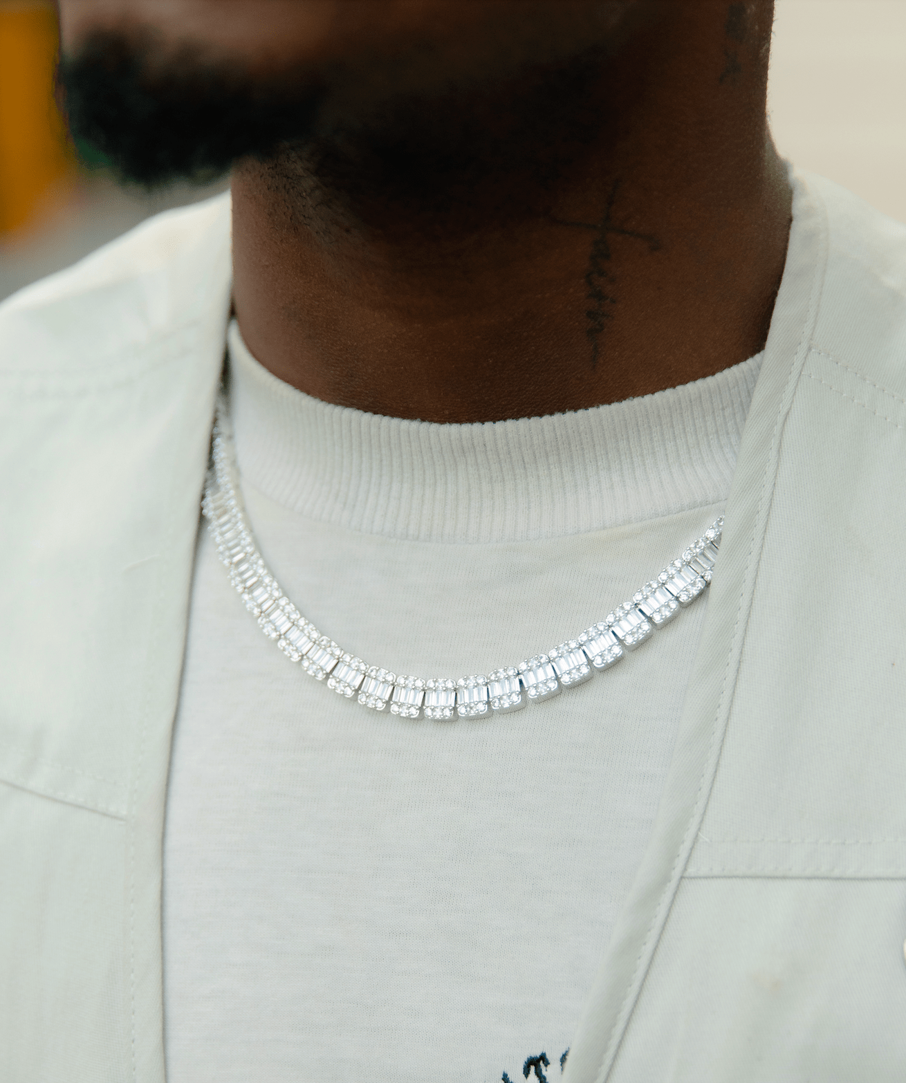 Deze baguette tennisketting is voorzien van een mix van baguette en rondgeslepen stenen die een unieke glans hebben die je van kilometers afstand kunt zien. Een geweldige mix tussen opvallend en minimalistisch, deze ketting mag zeker niet ontbreken in je collectie.