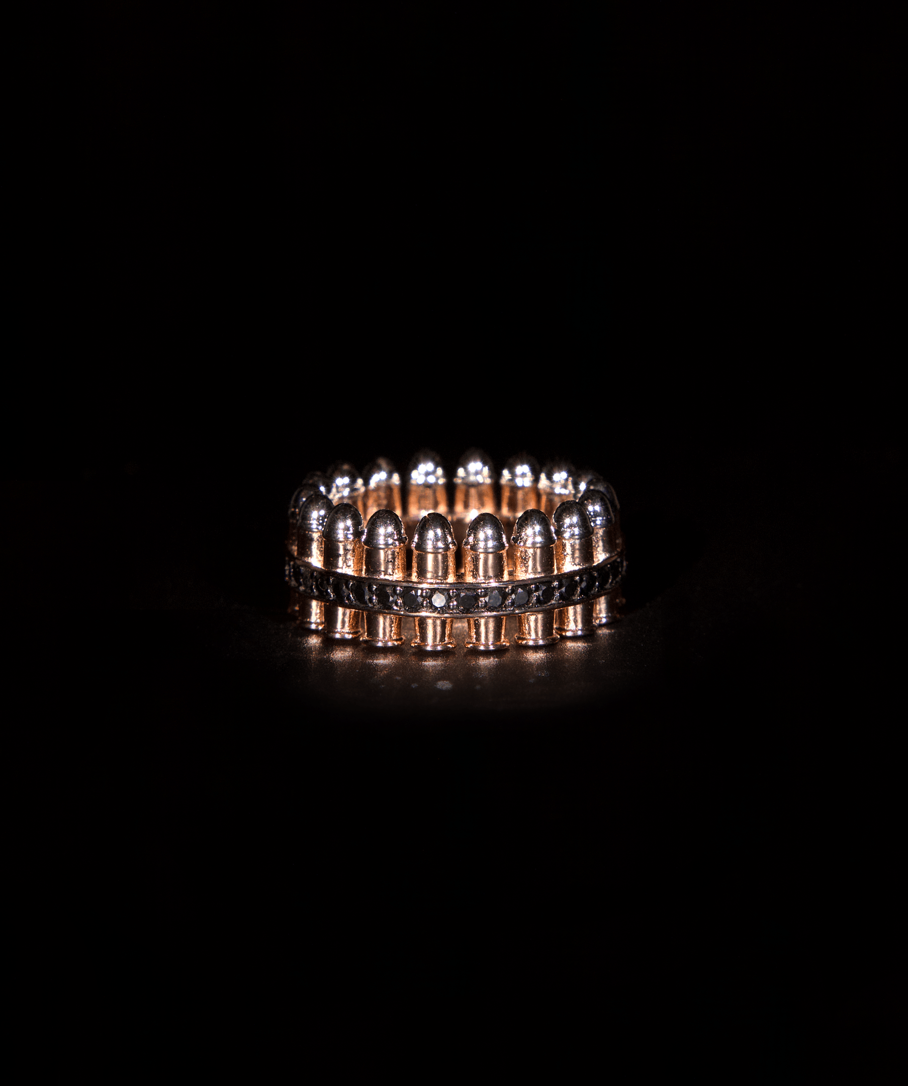 De Bullet Ring is een onverschrokken statement van kracht en precisie, een combinatie van avant-garde design en onberispelijk vakmanschap. Dit opvallende sieraad omringt de vinger met minutieus gebeeldhouwde kogelmotieven en is versierd met een rij zwarte diamanten, die een opvallend contrast vormen met de rijke gouden zetting.