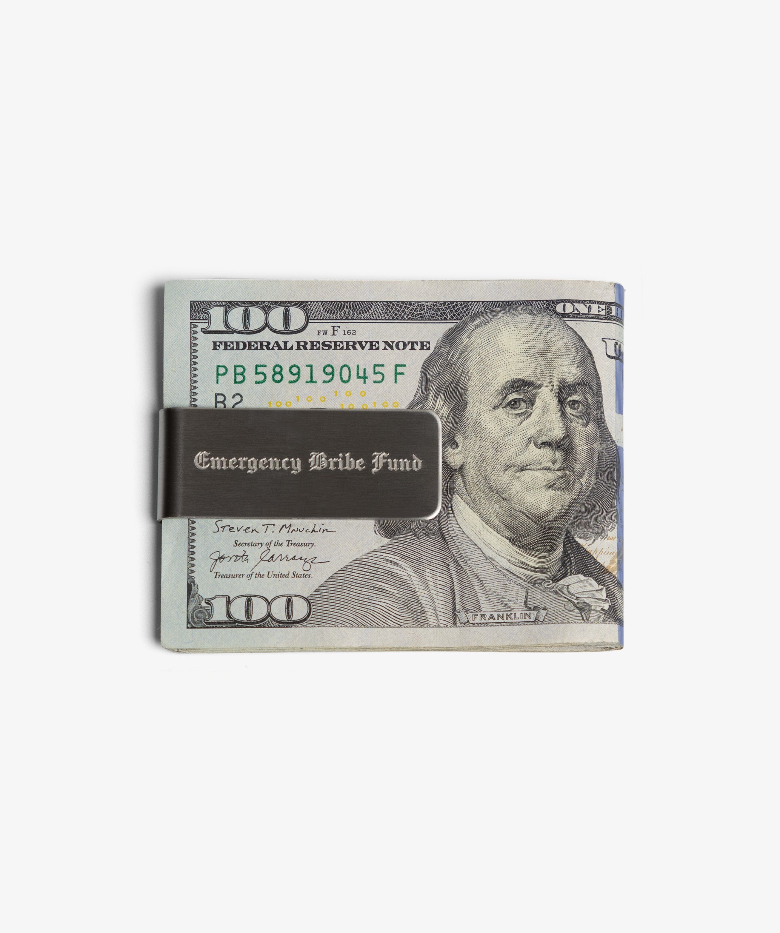 ICED London brushed-silver metal card with engraved text: “Emergency Bribe Fund.”