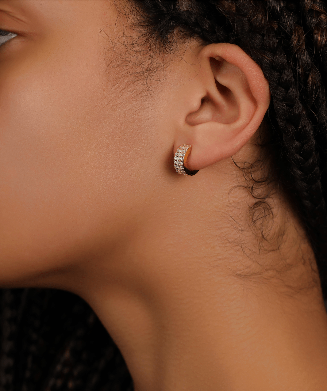 De Huggie Hoop-oorbellen bieden een balans tussen structuur en glans, vervaardigd in 925 zilver met een geelgouden plating voor een langdurige afwerking. De drievoudige zetting is ontworpen voor een goede pasvorm en maximaliseert de schittering, terwijl een strak, draagbaar profiel behouden blijft. Een veilige scharniersluiting zorgt voor draagcomfort, waardoor ze een veelzijdige aanvulling zijn op elke collectie.