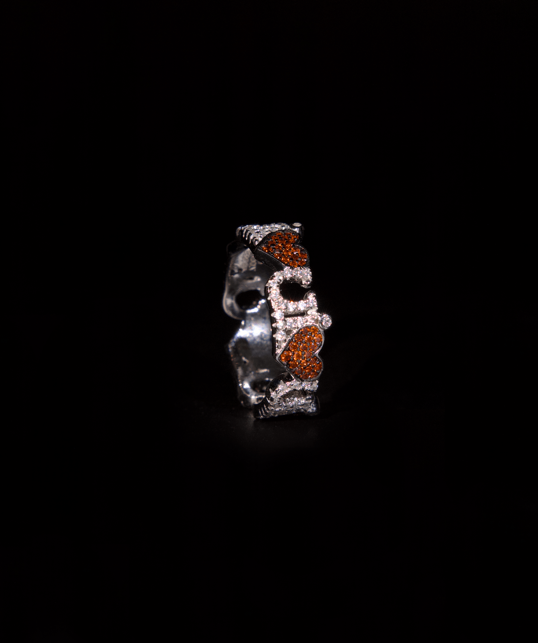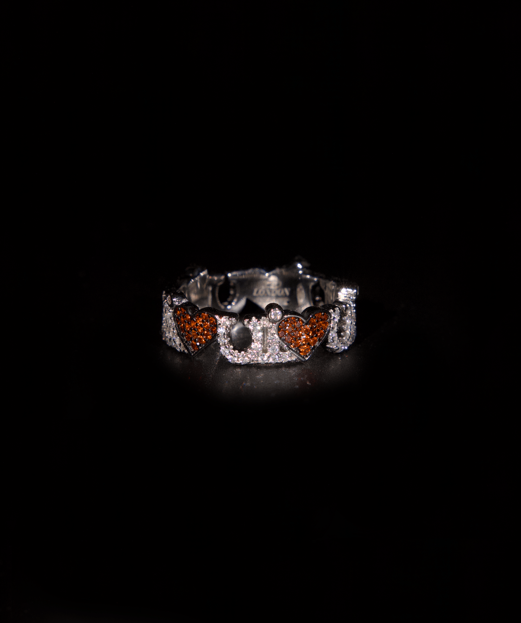 De I Heart U-ring transformeert sentiment in een complex meesterwerk, dat romantiek verweeft met een gedurfd design. De doorlopende band, gebeeldhouwd in massief 925 zilver, toont de zin "I ♥ U" in een architectonische structuur. De harten, bezaaid met dieporanje saffieren, brengen passie en warmte in dit symbool van toewijding.