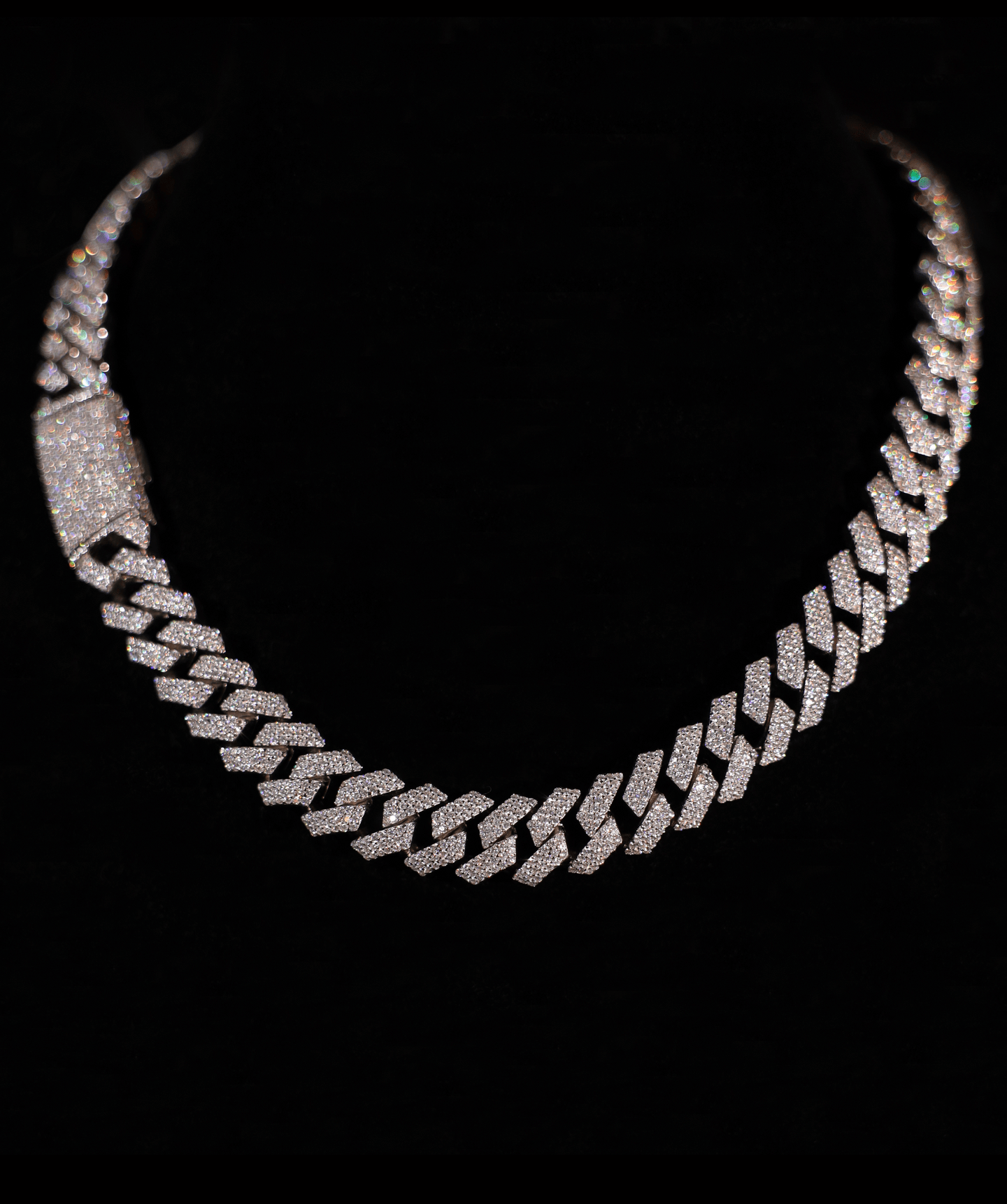The 15mm Prong Cuban Link Chain takes the iconic Cuban silhouette and elevates it with prong-set stones, maximising light reflection from every angle. A balance of weight and precision, designed for those who appreciate bold design without compromise.