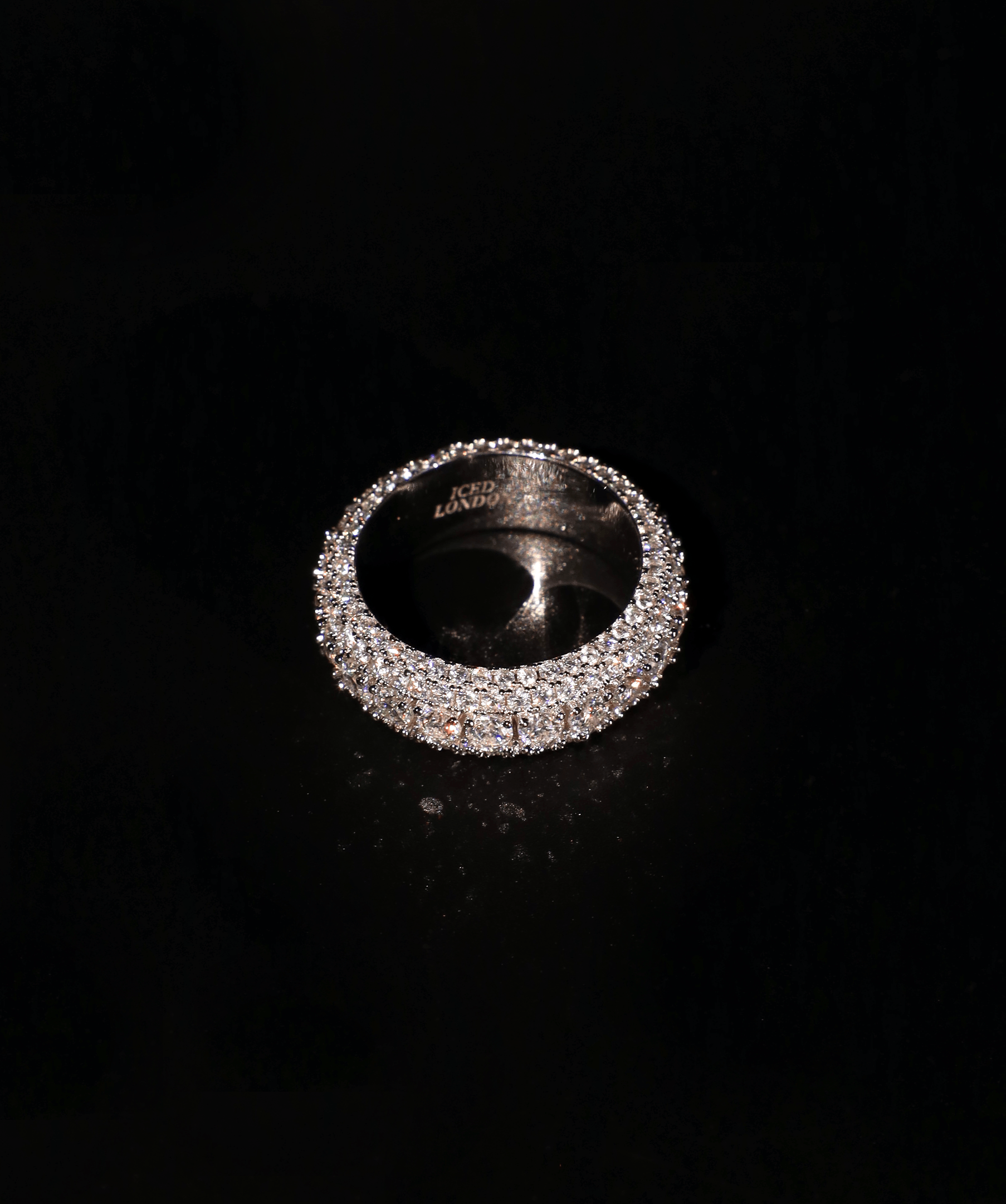 The 5-Row Band Ring is engineered for those who seek presence and power in their jewellery. Featuring a dynamic blend of pavé and prong-set stones, its multi-dimensional structure catches and reflects light from every angle. The central row of bold round-cut stones is framed by intricate pavé detailing, enhancing depth and intensity. With a 9.4mm width and a robust yet comfortable fit, this piece asserts itself effortlessly. Inside, the ICED LONDON engraving signifies authenticity, marking it as a creation of uncompromising quality. A ring not just to wear but to own—a symbol of status, ambition, and distinction.