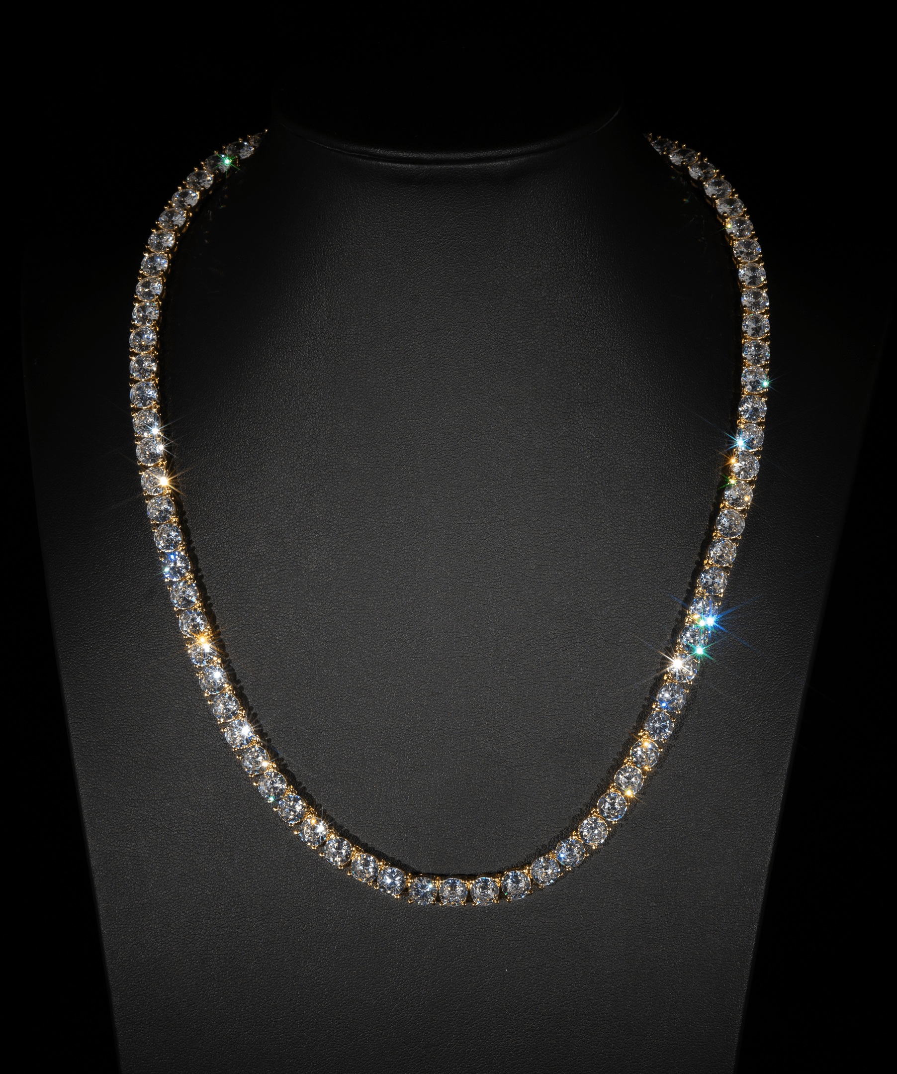 A staple of status and style, the 6mm Tennis Necklace delivers unrelenting shine with its perfectly aligned round-cut stones. Each link is precision-set to create a seamless flow of light, ensuring maximum radiance at every angle. Designed for those who appreciate both craftsmanship and presence, this piece offers a balance of weight and comfort, allowing it to sit effortlessly on the neck. The secure clasp ensures durability, making it a statement that lasts beyond the moment.