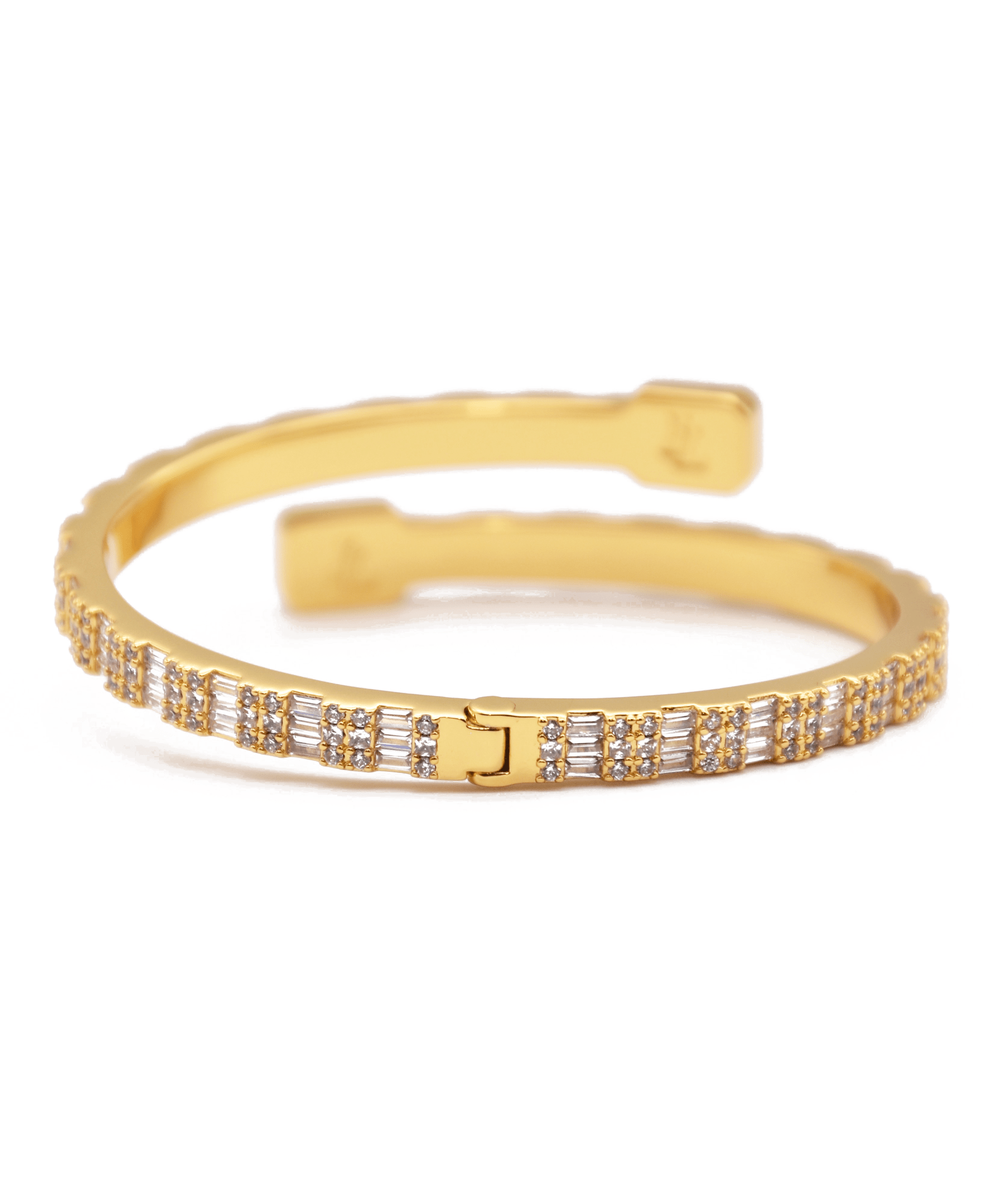 This Iced London Unisex Baguette Bangle is made from real 18k gold, featuring over 90 hand-selected baguette stones and over 240 brilliant round-cut stones, guaranteed to upgrade any fit.