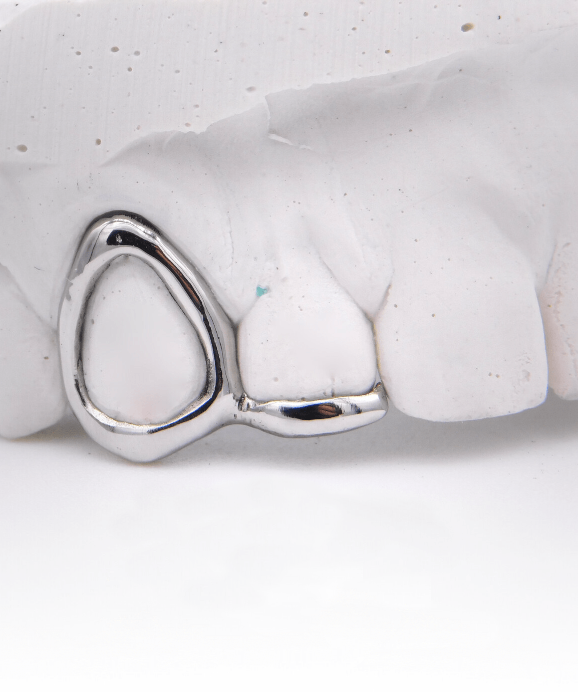 Custom gold window tooth & gold strip made to perfectly fit over your teeth. The teeth are available in dental gold, solid 9k or 18k yellow, white or rose gold. They are made to clip-on to your own teeth, removable at any time. Mirror finish shine comes as standard.