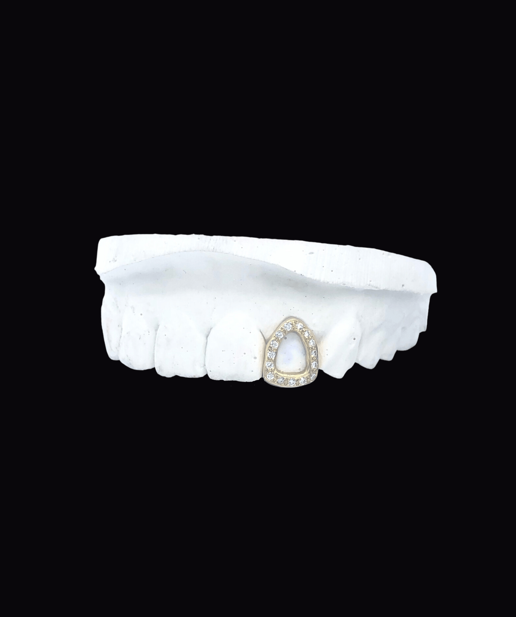 Custom made single iced window tooth made for any of your 8 top front teeth or 8 lower front teeth. Iced out with real VVS diamonds or Moissanite. Available in dental gold, solid 9k or 18k yellow, white or rose gold. They are made to clip-on to your own teeth, removable at any time.