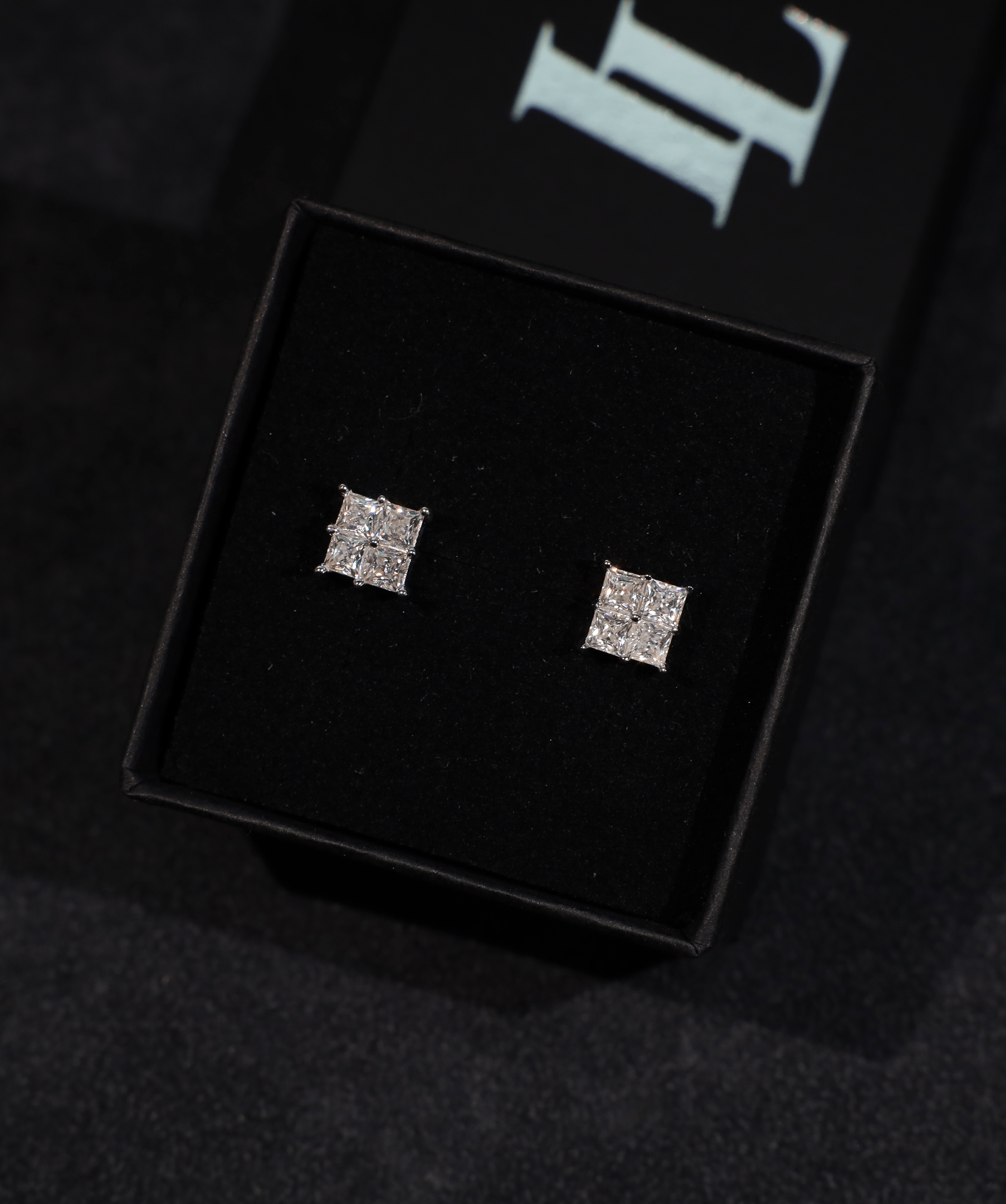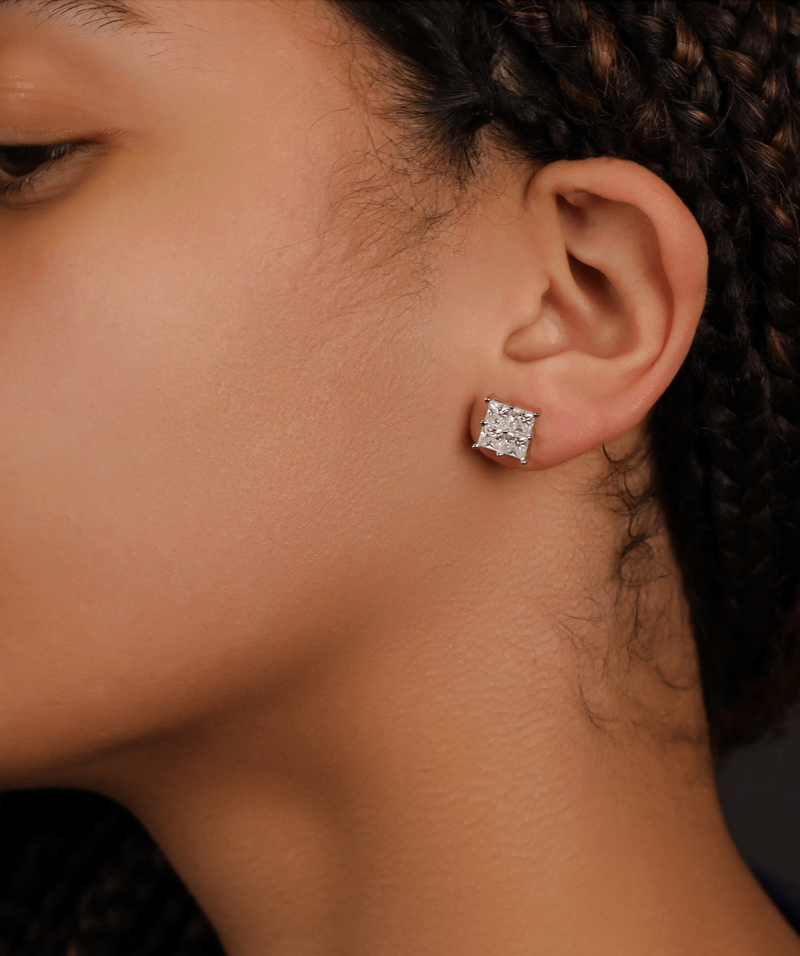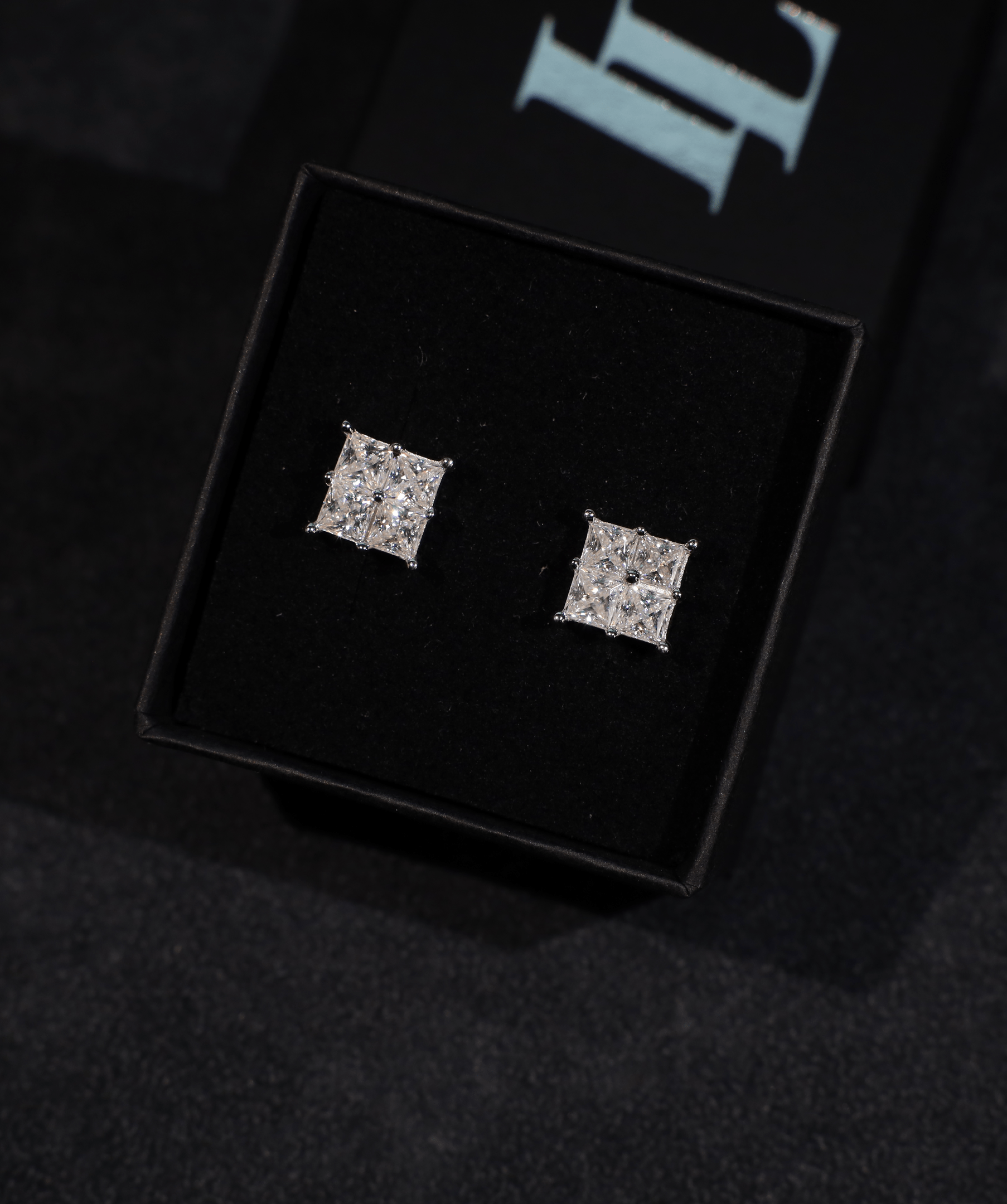 These Quad Princess-Cut Stud Earrings combine four precision-cut moissanite stones into a seamless square, amplifying brilliance and symmetry. Set in 925 silver with a secure four-prong setting, they create a bold yet refined aesthetic. A contemporary take on the classic stud, available in three sizes to suit different styles.