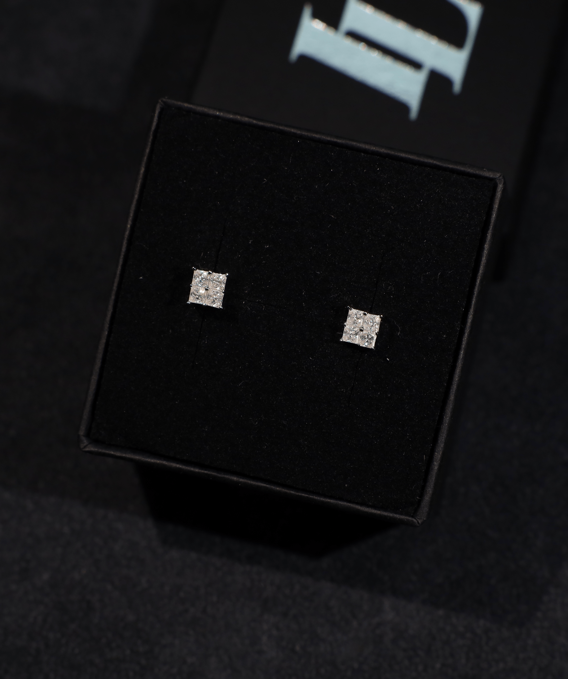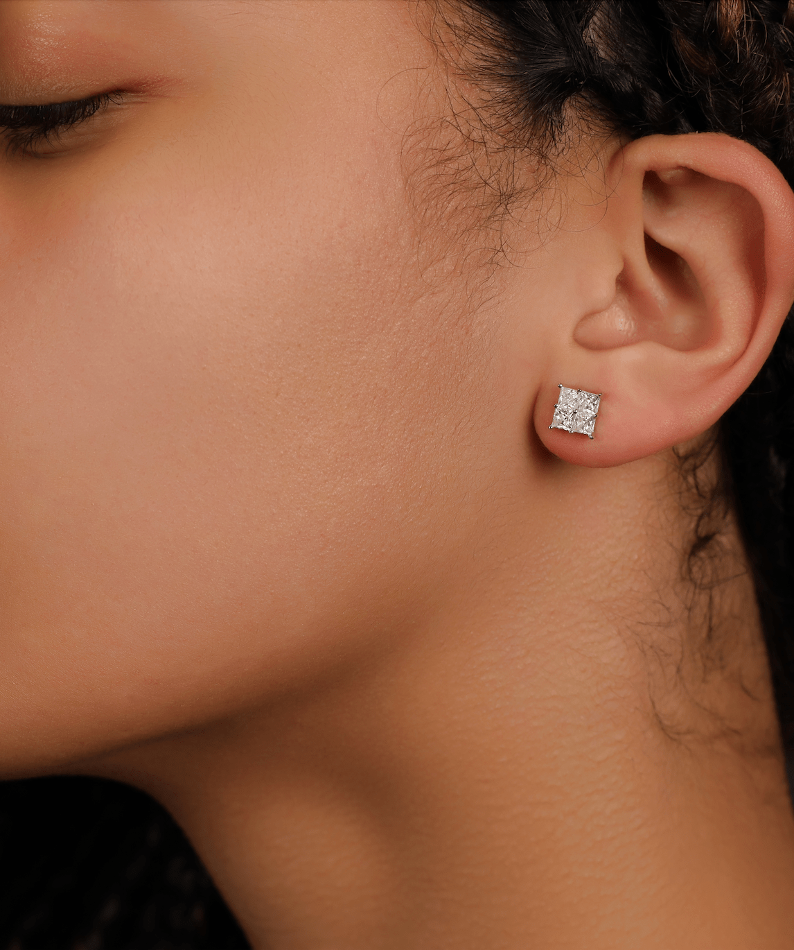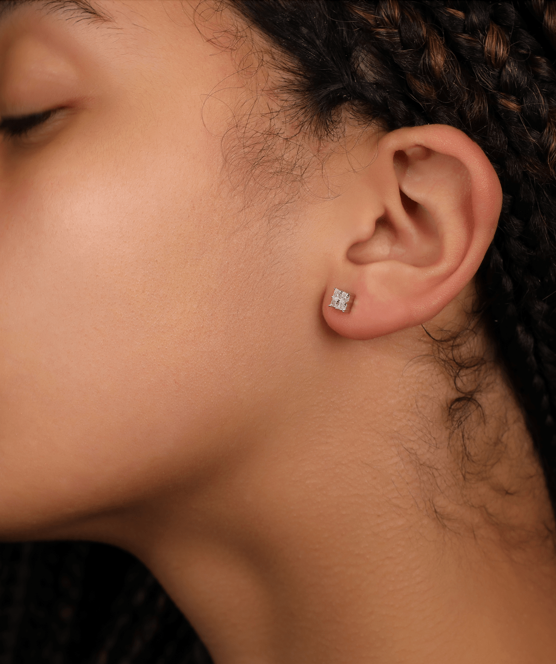 These Quad Princess-Cut Stud Earrings combine four precision-cut moissanite stones into a seamless square, amplifying brilliance and symmetry. Set in 925 silver with a secure four-prong setting, they create a bold yet refined aesthetic. A contemporary take on the classic stud, available in three sizes to suit different styles.