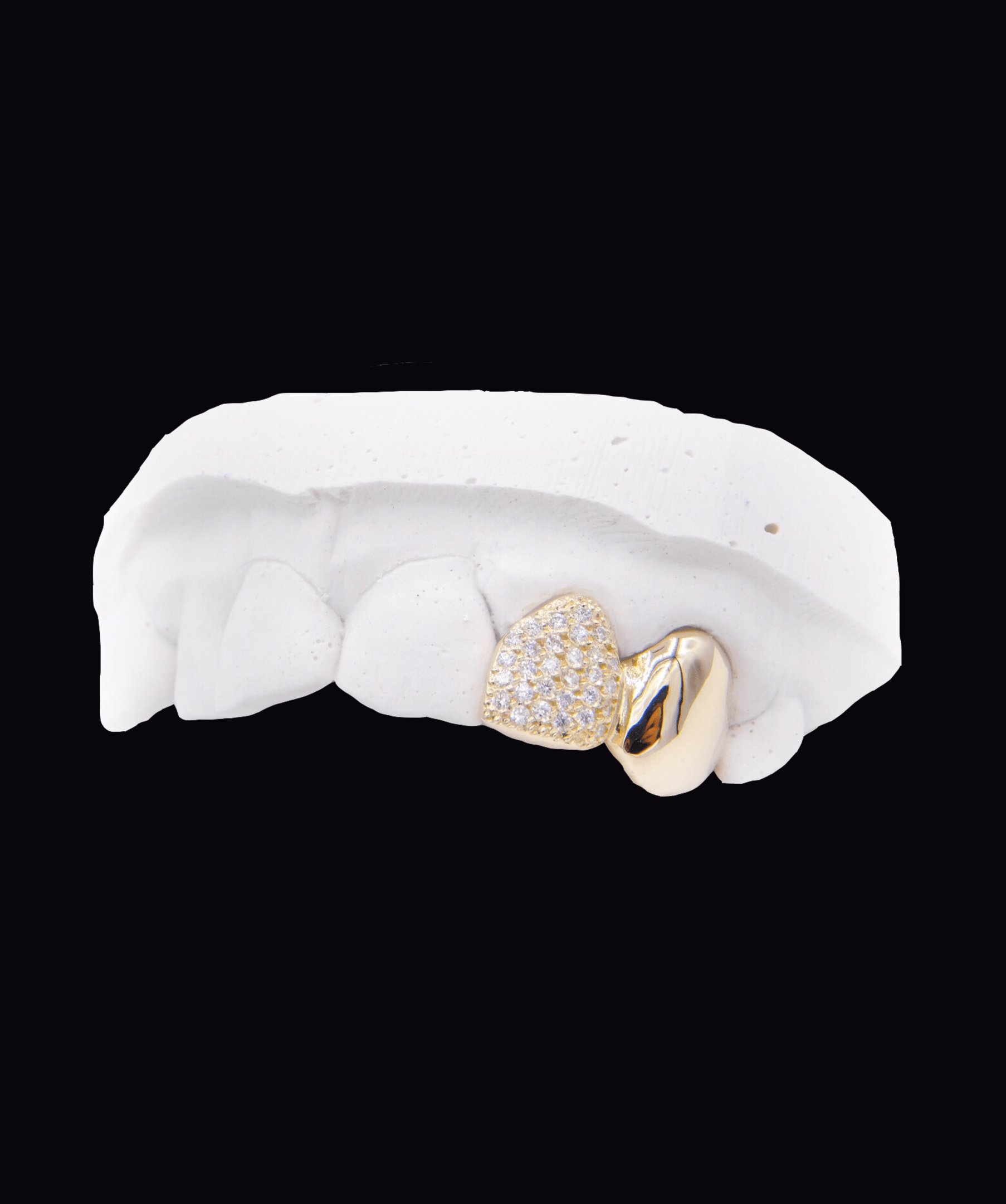 Custom made piece of two teeth; one is fully iced out and the other is plain gold, connected as one piece. Made for any of your front teeth. Can cover one missing tooth. Iced out with real VVS diamonds or Moissanite. Available in dental gold, solid 9k or 18k yellow, white or rose gold. They are made to clip-on to your own teeth, removable at any time.