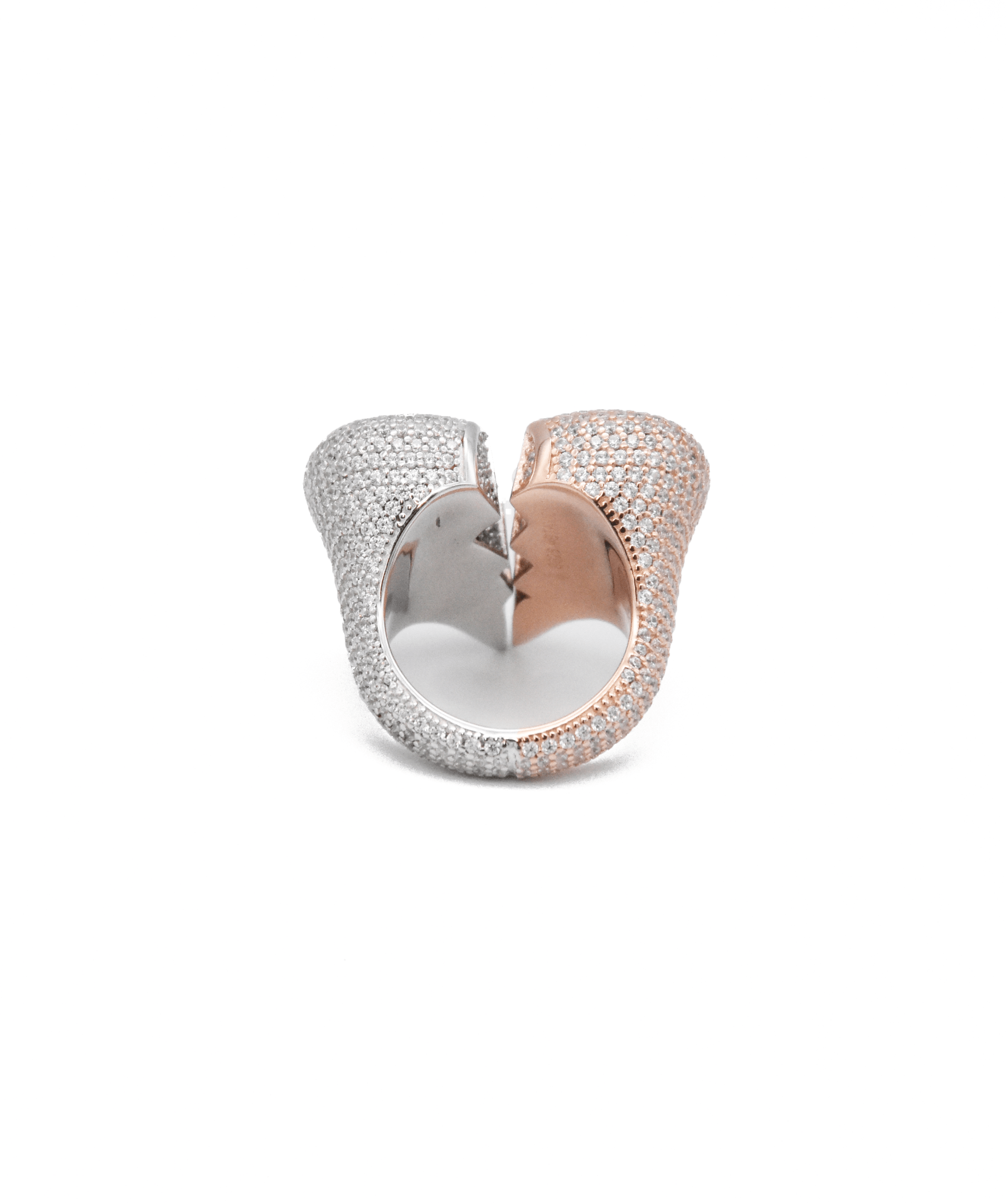 Iced London's Two-Tone Diamond Broken Heart Ring is flooded with over 600 stones, each individually hand-set. It is iced out on all angles, including the inside of the broken heart, which goes to show the level of time, detail and craftsmanship invested into making this piece. The ring is made up of 100% precious metals made from 925 sterling silver and 5A CZ.